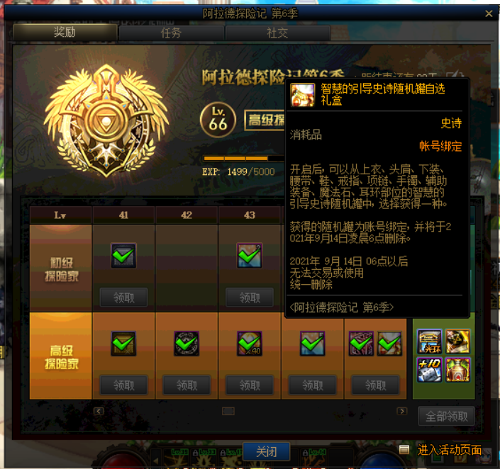 冒险家账号内所有角色在智慧的引导获得的史诗装备,都会点亮对应的史诗图鉴,在图鉴上点亮了30个史诗装备还可以点亮任意一件史诗,这个操作只能进行一次。活动结束之前,可以任选一套已点亮的史诗套装,领取到账号内的任意一个角色。