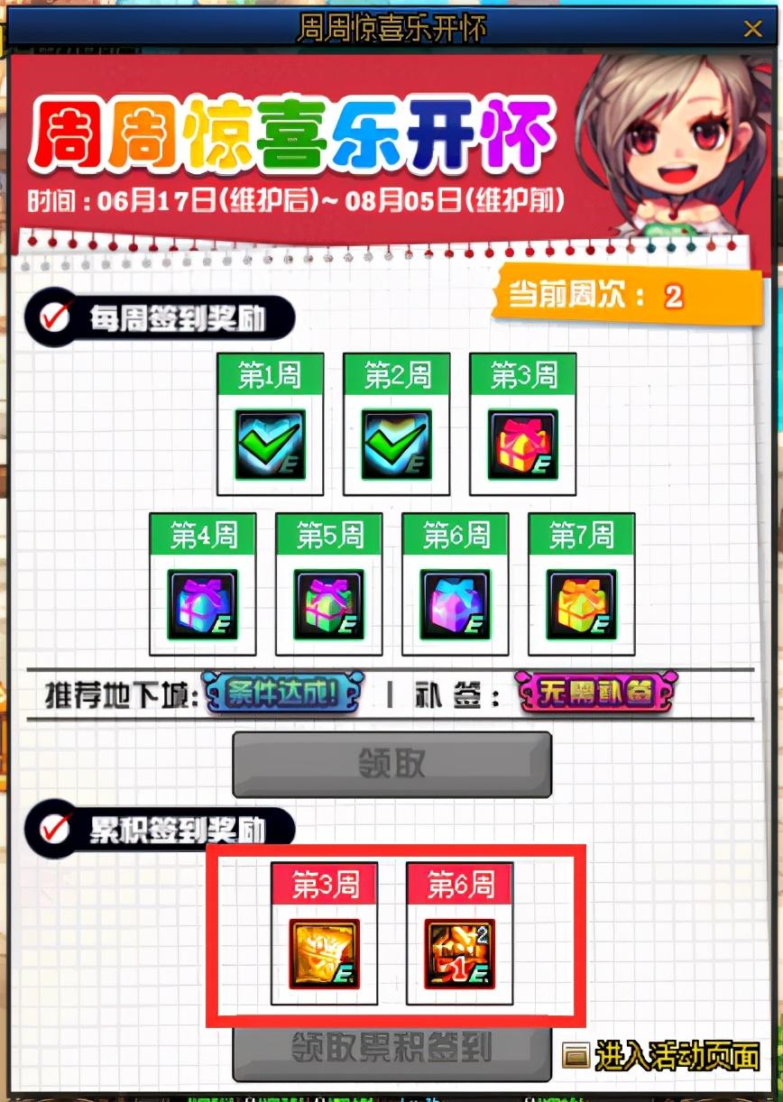 这个活动是我们的老朋友了,在累积签到三周就可以获得一个Lv100史诗自选礼盒(武器除外),累积签到六周就可以获得两个Lv100史诗跨界石。小伙伴们在刷智慧的引导时爆出的装备不要着急分解,万一在哪个角色上用到呢。