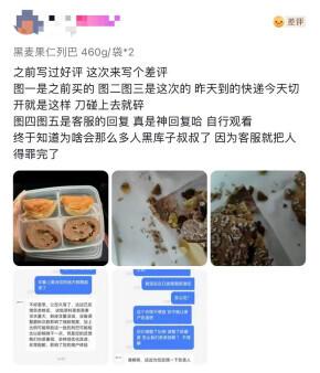 还有更多的用户反映,彩虹星球售卖的列巴质量在下滑。“核桃和黑加仑的搭配量没有一年前多,列巴留白处太多,吃起来干巴巴的没有以前好吃”“陆陆续续买了10个了,没法判断是不是料比以前少了……反正越来越不满意”“昨天到的快递,今天切开刀碰上就碎……终于知道为啥那么多人黑库子叔叔,客服就把人得罪完了”……