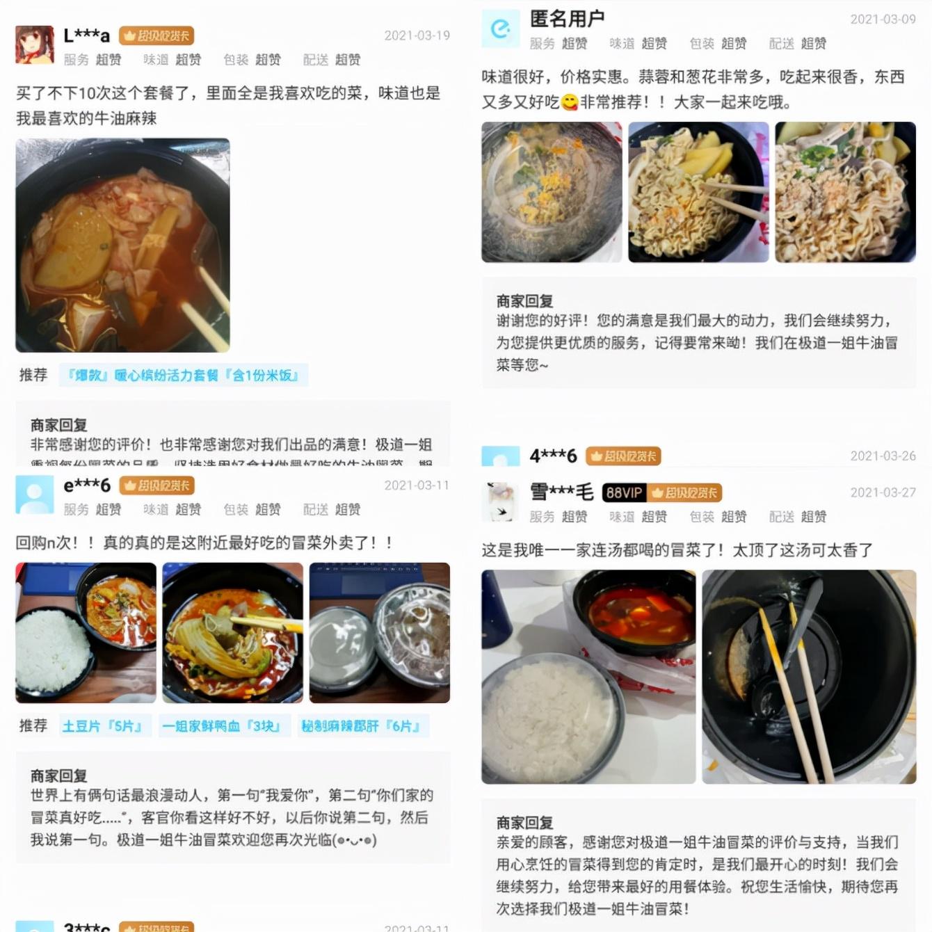 在极道一姐的外卖评价中,“味道好”占据了 80% 以上,有人一周复购 3 次,复购率高达27%,甚至有人连汤一起喝掉,其中老顾客占了大部分。