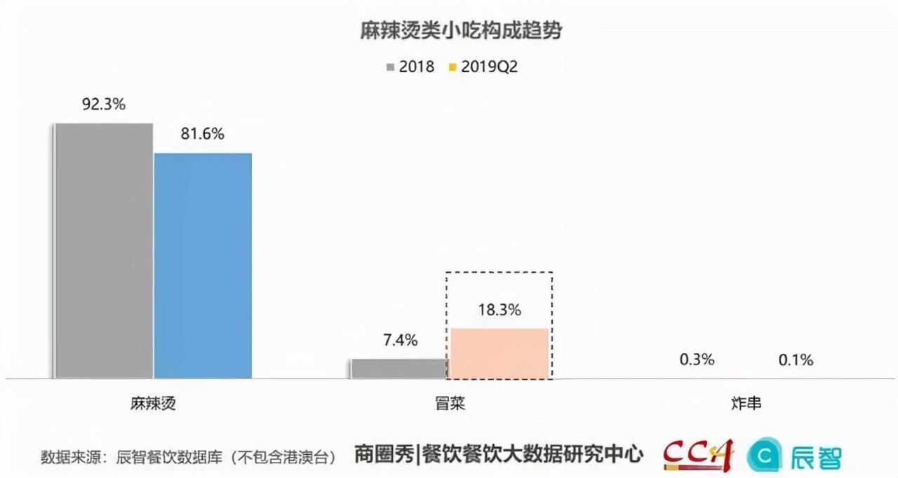 中国烹饪协会发布的《2019中国餐饮行业小吃品类大数据分析报告》显示,2018~2019年,麻辣烫类小吃主要以麻辣烫为主,但随着市场竞争的激烈,到2019年,麻辣烫的占比由2018年的92.3%跌落到81.6%,冒菜则增长了10.9%,呈现出快速上升趋势。