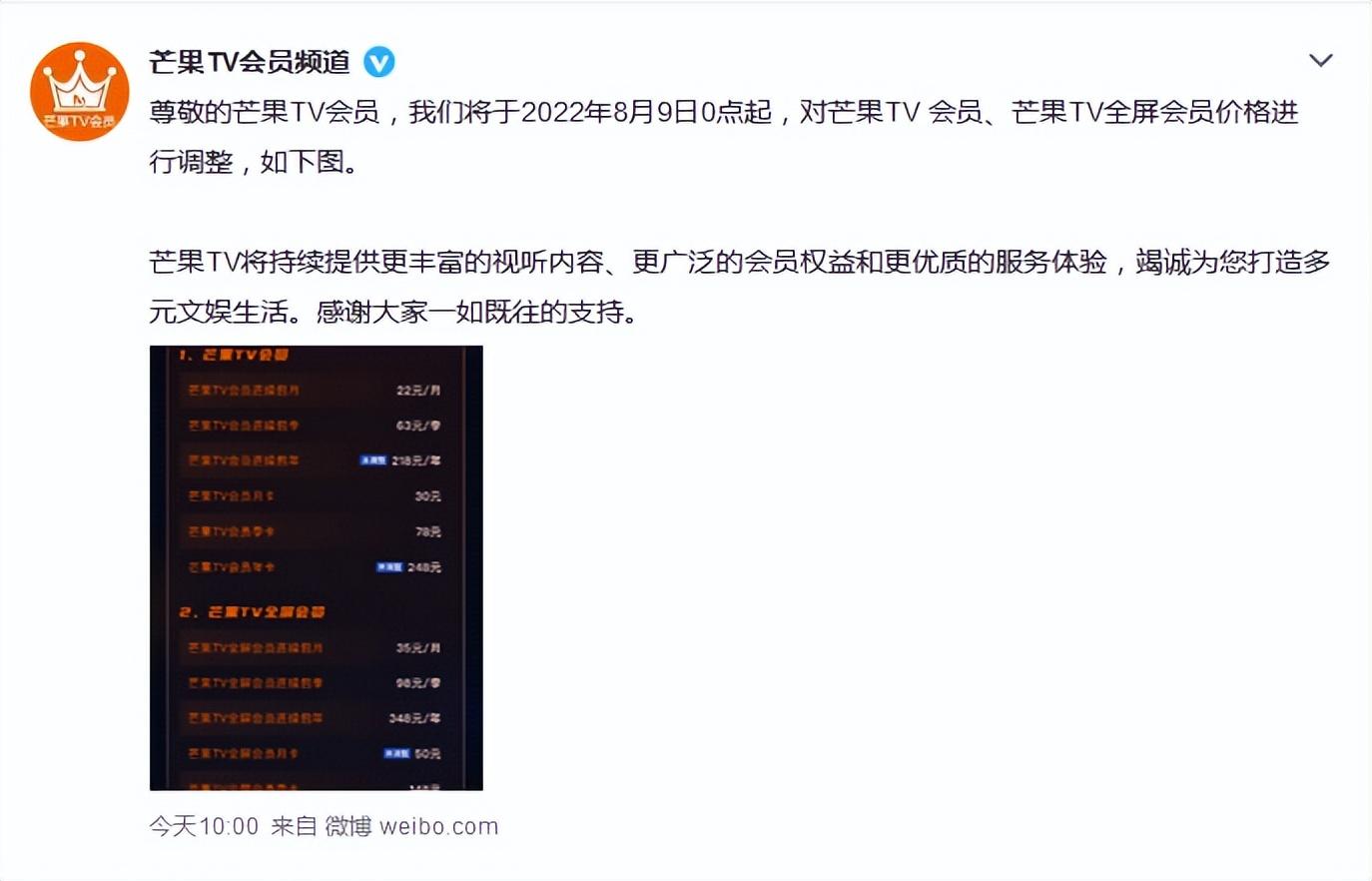 7月27日,芒果TV发布通知,将于8月9日零点调整芒果TV会员价格。涨价后,芒果TV会员连续包月为22元/月,涨价3元,会员月卡为30元/月,涨价5元,芒果TV全屏会员连续包月价格为35元/月。值得注意的是,去年12月,芒果TV就曾对会员价格有过一次调整。
