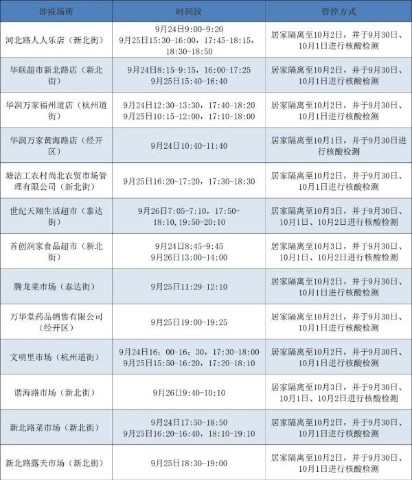 凡自9月26日以来,到访过河西区东海街泗水道与枫林路交口58优品超市旅居史的人员,请立即居家静止并主动向居住地社区报备,自即日起实施居家隔离医学观察(同住/同行人员同步管理)满末次到访后7天,核酸日检测,如同行人员未扫描场所码,应一并告知街道(社区)同步管理。判定为密接或高风险人员按照相关规定管理。