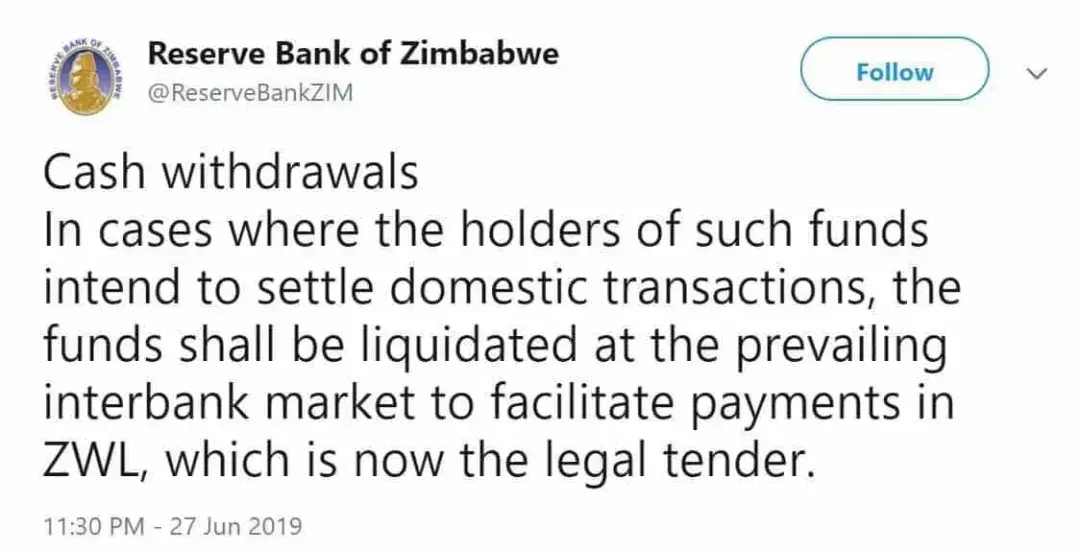 以下是津巴布韦储备银行社交账户所发布的英文声明: