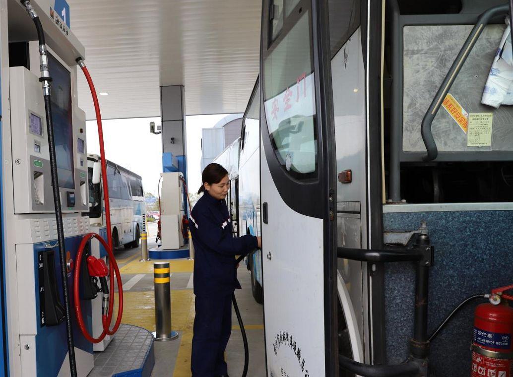元旦,在台州市客运中心南站综合供能服务站,浙江浙石油综合能源销售有限公司台州分公司员工为顾客加油。