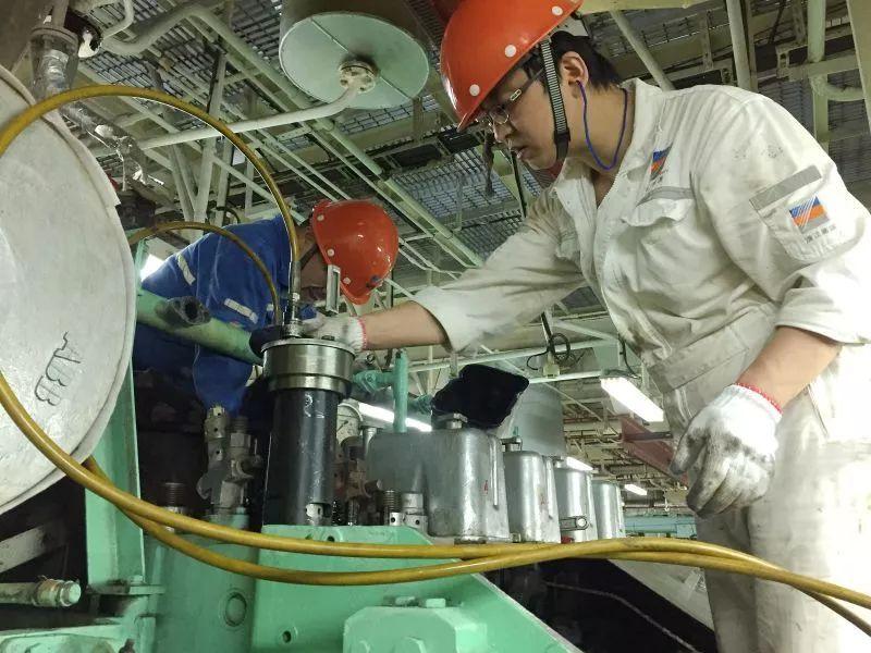 元旦当天,宁波海运集团有限公司所属五星班组“明州59”轮在锚地锚泊期间,对船舶主机进行吊缸保养。