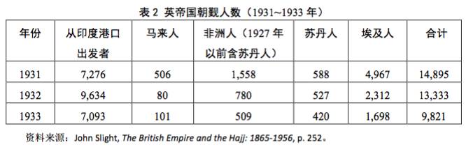 1931~1933年,海路朝觐者与1930年(84,821人)相比呈断崖式下跌,1931年为39,346人,1932年为29,065人,1933年为20,705人。英帝国朝觐者人数与之前相比也呈锐减态势,已从1930年的近3.6万人跌至1933年的不足万人。