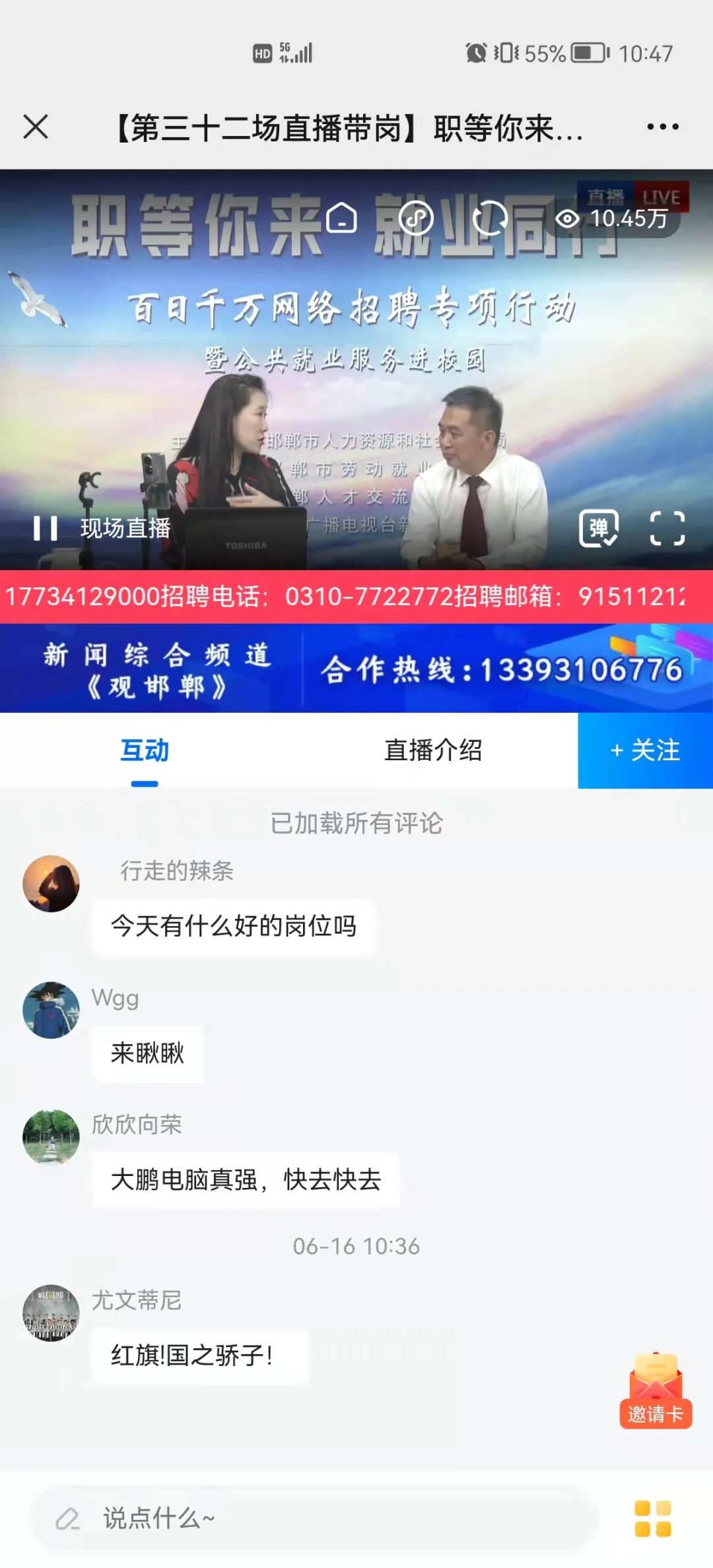 6月16日,由邯郸市人力资源和社会保障局主办,邯郸市劳动就业服务局、邯郸人才交流开发中心、邯郸广播电视台新闻综合频道承办的第三十二场“职等你来 就业同行”——百日千万网络招聘专项行动暨公共就业服务进校园直播带岗活动成功举办。