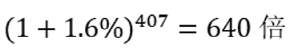 根据期望收益率对总体盈亏做处理后,407年的平均盈利是1.6%,1.6%的407次方复利是640倍: