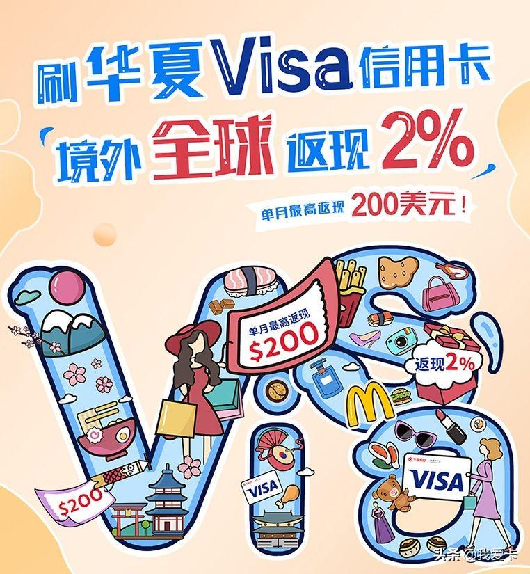 活动内容:使用华夏银行Visa标识信用卡在境外(非大陆地区)通过Visa渠道进行交易,可享受每月总交易额2%返现,每月最高200美元封顶。