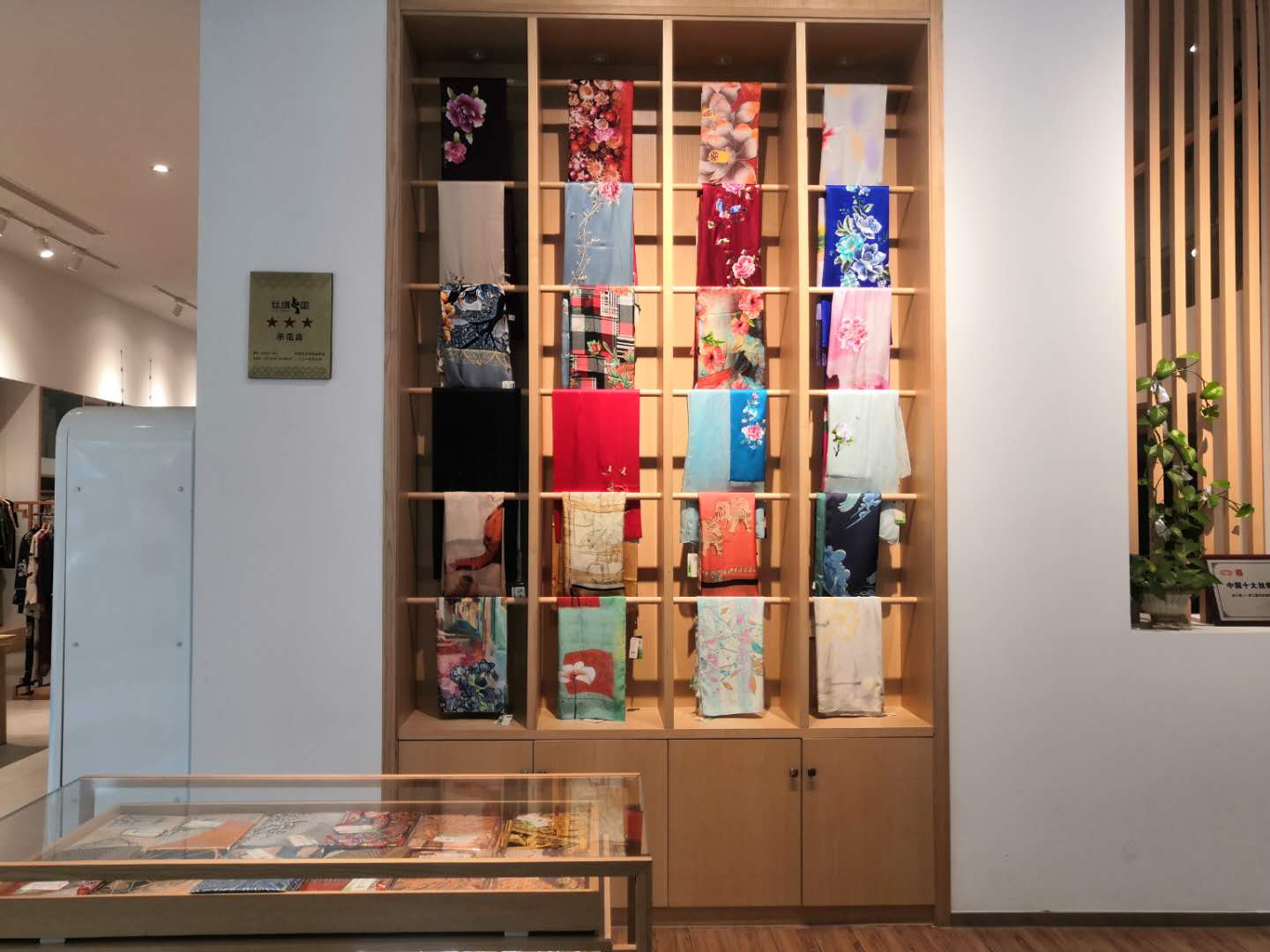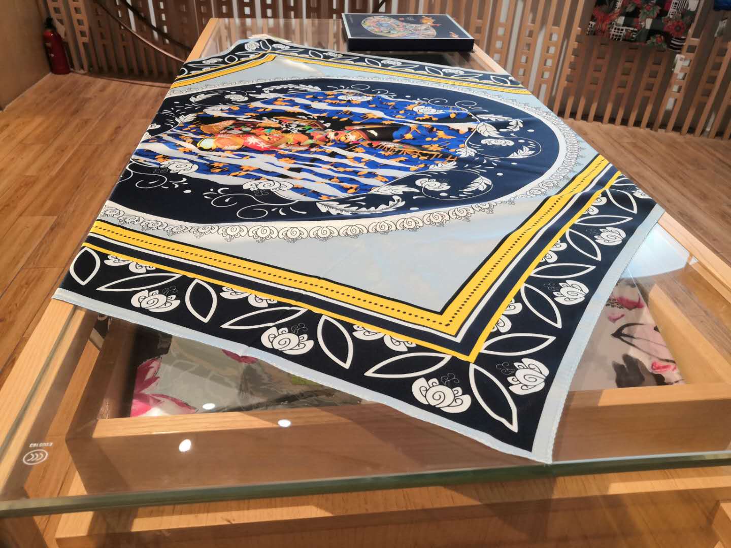 我的“屋子”就在进馆正对面那个挂满丝巾的专柜里,右下方那条印着仙鹤祥云图、浑身散发着端庄气质的就是我。