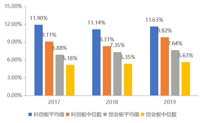 2019年科创板研发投入占比超过5%的公司有99家,占比76%,而同期创业板上市公司中,研发投入占比超过5%的公司占比约为55%。高研发投入体现了科创板公司相对更强的科技属性,也是板块长期业绩增长、行业竞争力的重要保障。(数据来源:华西证券、Wind;注:数据处理时剔除了各年份研发投入占比超过100%的极端值)