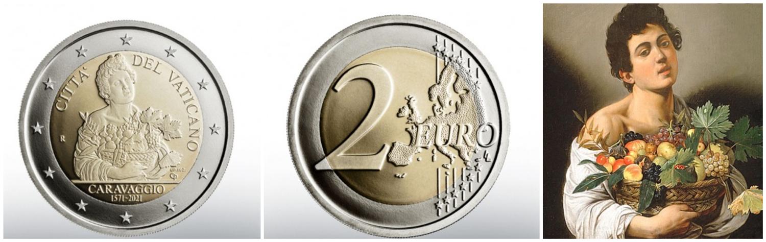 卡拉瓦乔,意大利画家,1593年到1610年间活跃于罗马、那不勒斯、马耳他和西西里,他通常被认为属于巴洛克画派,对巴洛克画派的形成有重要影响,币面设计为他的名画:捧果篮的男孩~