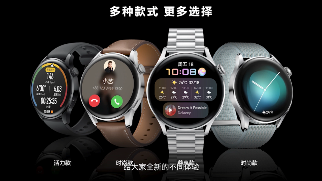 华为WATCH3系列采用全新3D旋转表冠,316L不锈钢表体 镜面级打磨,3D大曲率镜面,1.43英寸326ppi的圆形表盘,全新丰富的动态表盘,主要提供活力款、时尚款、尊享款、时尚款4个版本(表带材质不同),仅提供46mm表盘一个大小。