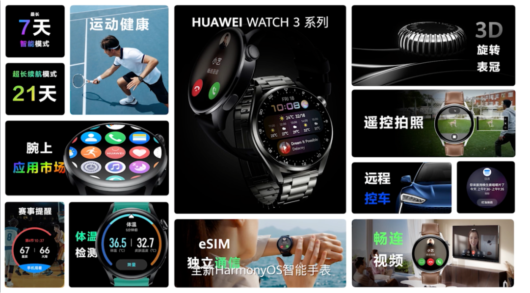 搭载HarmonyOS的华为WATCH3系列还支持跌倒检测、测量体温、血糖检测(和第三方合作)、吃药提醒等等。续航方面,