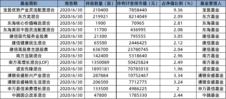 表1:ST舍得占基金资产净值超过2%的基金(数据截止2020.06.30)