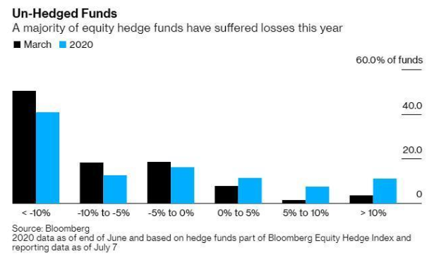 国际对冲基金因其做空能力有助于减轻股价下跌冲击的。但今年当3月市场暴跌时,彭博指数中的股票对冲基金中有87%亏损,其中一半下跌10%以上。随后股票反弹,但根据