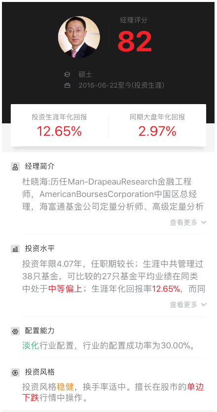 基金经理杜晓海属于典型的海归派量化投资基金经理,曾在Man-DrapeauResearch任金融工程师,AmericanBoursesCorporation任中国区总经理,其投资风格稳健,擅长在股市的单边下跌行情中操作。生涯年化回报率12.86%,综合评分82分,投资能力很强。