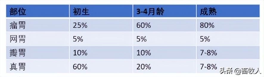 。初生犊牛(哺乳期犊牛)的瘤胃发育不全,仅占全胃重的25%,主要靠真胃(60%)和肠道吸收营养物质。随着年龄的增长,犊牛的瘤胃逐渐发育成熟。