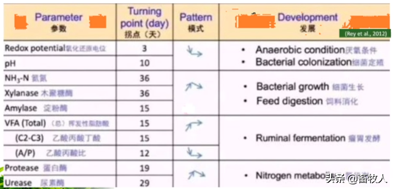 随着日龄的增加,犊牛羔羊瘤胃内的厌氧条件、细菌定殖和生长、碳代谢、氮代谢表现出不同的发育模式。部分指标随着日龄的增加,先增加后稳定;部分则先下降后稳定。其中,淀粉水解酶活性及果胶水解菌、木聚糖水解菌、硫酸盐还原菌、乳酸利用菌、纤维分解菌、产甲烷菌逐渐增加。