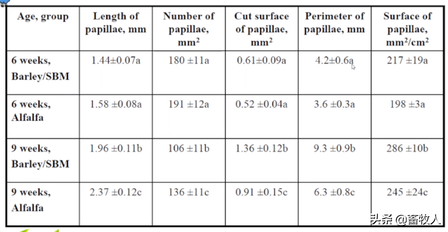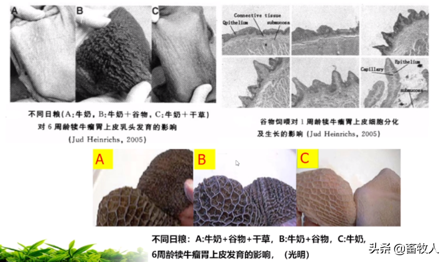 。瘤胃乳头的长度宽度随着日龄显著变化,初生时仅1mm,成熟时达5-7mm。试验发现,固态开口料中的精饲料,特别是能量,可显著促进瘤胃乳头的发育;饲喂牛奶+谷物+干草组(A组)犊牛的瘤胃发育显著优于其他两组;饲喂大麦+豆粕日粮组犊牛的瘤胃发育也显著优于饲喂苜蓿组。