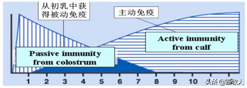 被动免疫在出生后几天便开始衰退,2月龄时完全丧失。出生1周后,牛羊体内的主动免疫系统开始发育,至3月龄时成熟。因此,1-8周龄是犊牛羔羊免疫缺陷期,易发生各种疾病,也是犊牛羔羊饲养的关键时期。