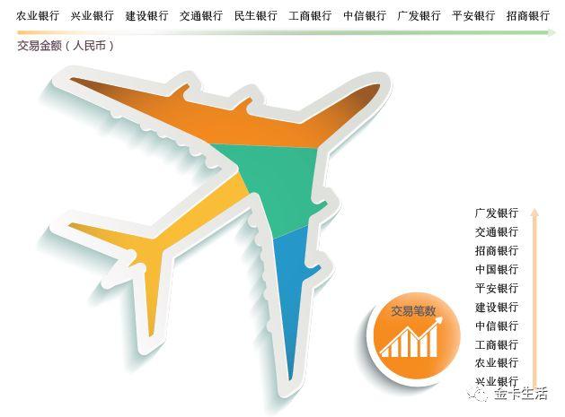 招商银行全国航空消费金额继续居于首位,平安银行和广发银行紧随其后;广发银行消费笔数从上一年度的第二名跃居第一,第二和第三分别是交通银行和招商银行。