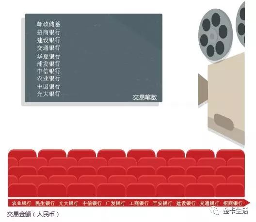 招商银行在全国电影院消费金额排行中位居首位,在消费笔数中则由邮政储蓄银行摘得桂冠。