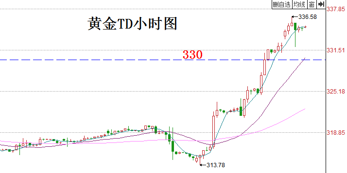 黄金TD小时图:金价上涨并刷新336.58新高,当前涨势还在,短线仍以多头思路对待;