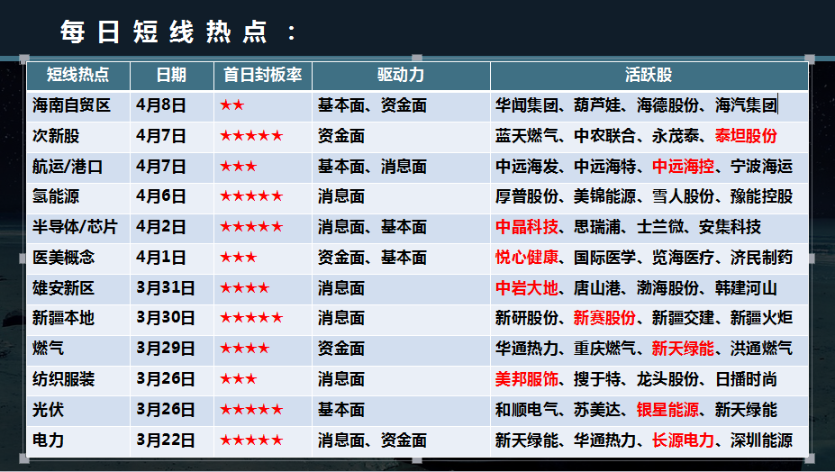 除了钢铁等资源股外,今日海南本地股异动也引起了旌阳视野的注意。其实旌阳视野在4月2日《【策略内参】:今日盘面暗示节后主力已有猛攻对象》的分析中已经提到,4月需谨防炒地图行情出现。且在小长假期间,也发出《【特刊】:五大区域性重磅利好吹响集结号,将成4、5月最大热点》。在上述两文中都已经提到海南本地股在4月可能出现的投资机会。值得注意的是,今日早盘消息,《海南自贸港放宽市场准入22条特别措施发布》,在该消息刺激下海南本地股发起第一轮攻击,华闻集团、葫芦娃、海德股份、海汽集团等多只股大涨。需要留意的是节前已经启动的大东海A(000613),龙虎榜上已现机构买入痕迹。但需要指出的是,该板块今日上涨但封板率不高,后市必定出现分化。