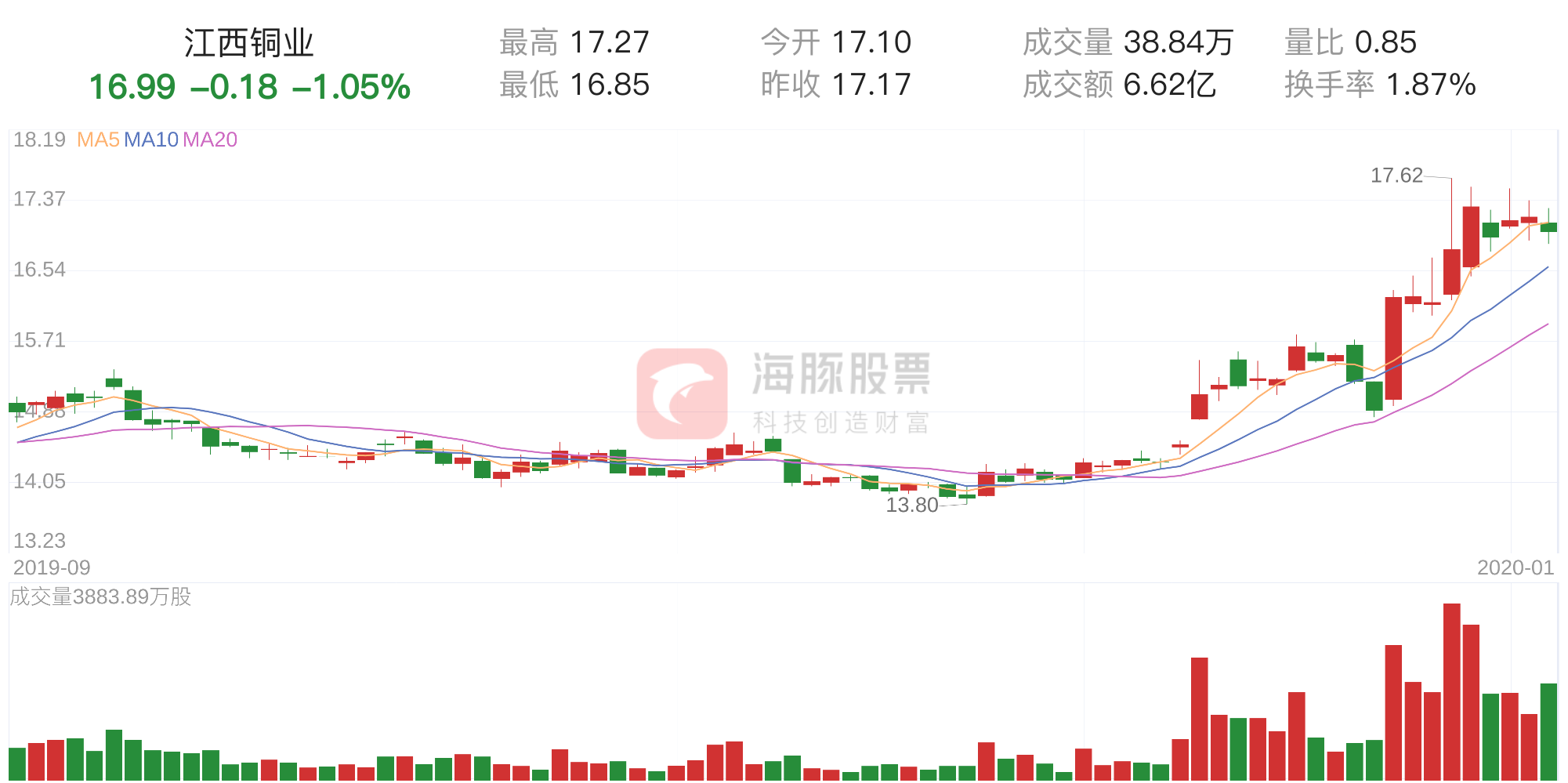 根据海豚股票数据统计显示,截至收盘,江西铜业股价报16.99元,涨跌幅为-1.05%,换手率为1.87%,全天成交6.62亿元。