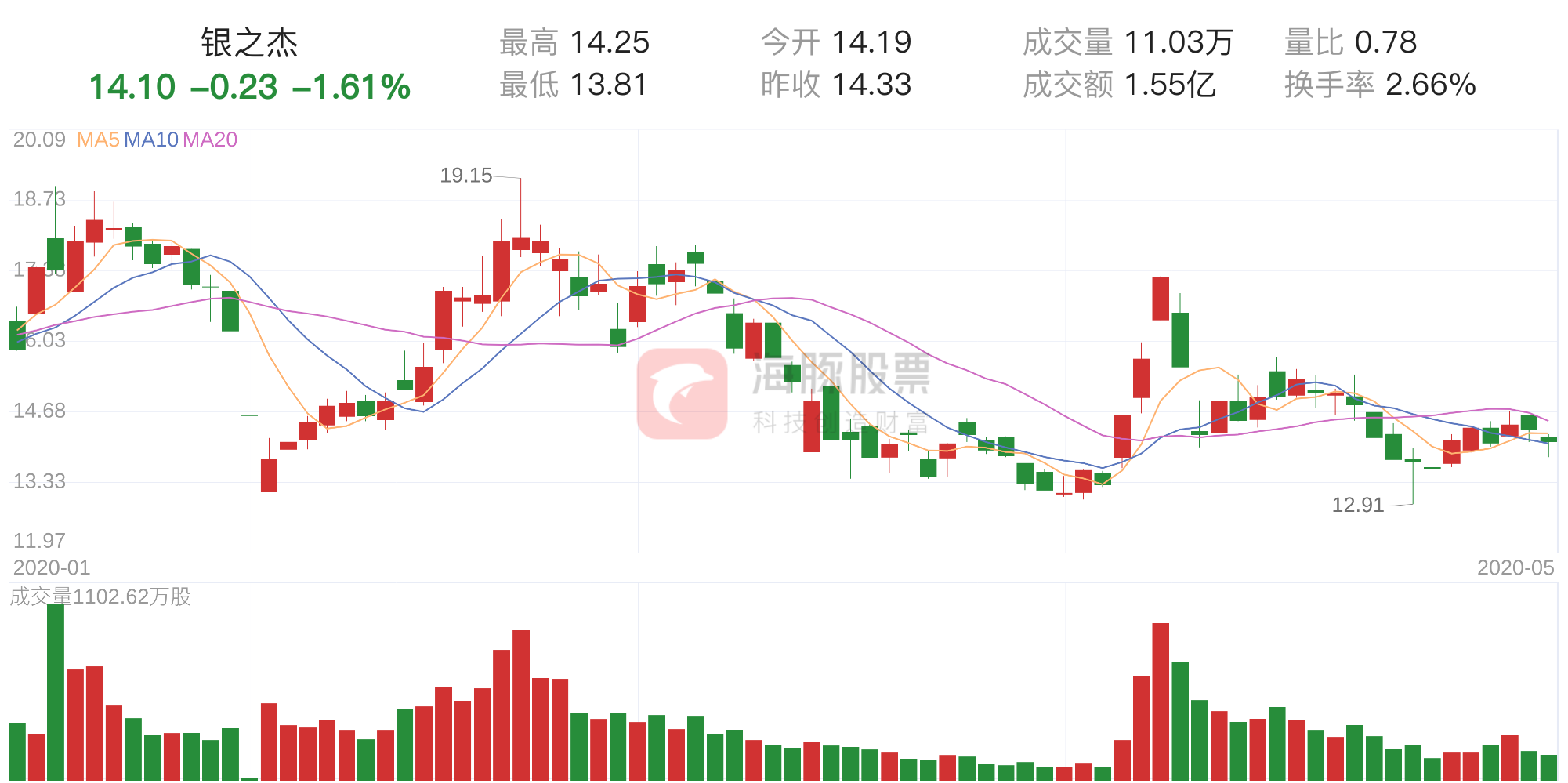 根据海豚股票数据统计显示,截至收盘,银之杰股价报14.10元,涨跌幅为-1.61%,换手率为2.66%,全天成交1.55亿元。