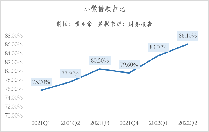 2022Q2财报显示,报告期内,陆金所控股新增贷款人民币1295亿元,其中小微实体企业季度新增贷款占比同比提升8.5个百分点,达到86.1%,创历史新高。
