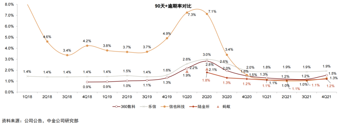 从统计数据来看,与360数科、乐信、信也科技等公司对比,陆金所控股90天以上的整体逾期率基本处于同业最低水平。